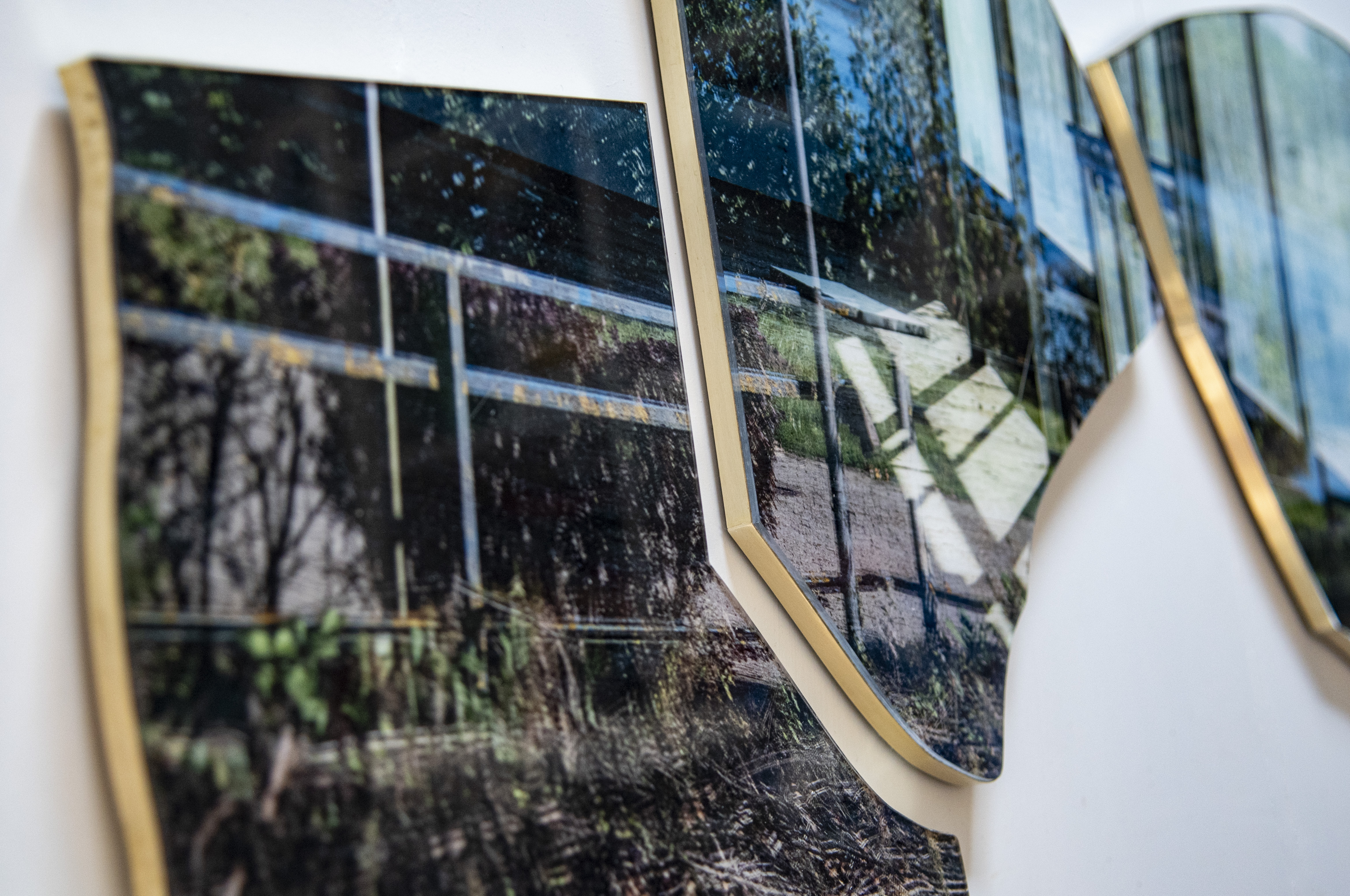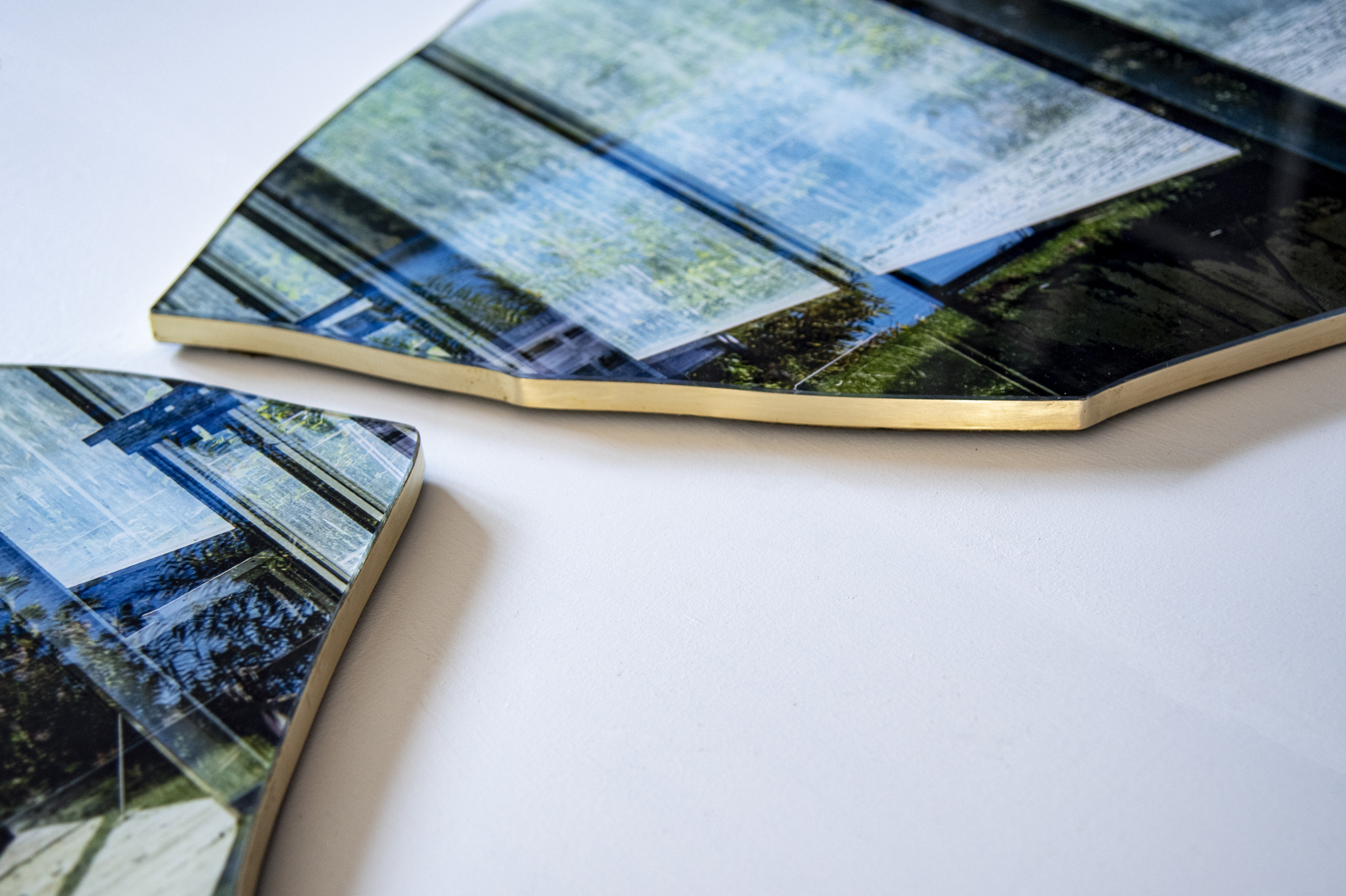 The installation-based series sch:ein:bruch visualizes the collapse of human constructs. The photographic work originates from a medium format camera and is produced as an ultra-high-resolution pigment print, mounted on aluminium dibond and sealed under acrylic glass. It is milled into shard-like shapes and encased by hand in brass.
